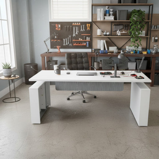 View full detailsBrand: Juniper Office Model: L-Shape Think Desk with Modesty Panel Material: Wood MSRP: $1635 Dimensions: W 60-72", D 66"-78", H 26.5"-52" Color: G...