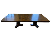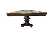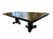The expansive tabletop boasts a rich, deep wood finish adorned with a sophisticated geometric marquetry pattern, creating a captivating visual texture that speaks of skilled artistry. Supported by two intricately carved, substantial pedestal bases, each featuring elegant fluting and robust turning, this table exudes a timeless grandeur.